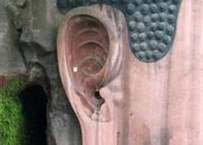 大佛右耳耳垂根部内侧,有一深约25厘米的窟窿,维修工人从中掏出许多破碎物,细看乃腐朽了的木泥。这证实了南宋范成大在《吴船录》中的记载“极天下佛像之大,两耳犹以木为之”。由此可知,长达7米的佛耳,不是原岩凿就,而是用木柱作结构,再抹以锤灰装饰而成。在大佛鼻孔下端亦发现窟窿,内则露出三截木头,成品字形。说明隆起的鼻梁,也是以木衬之,外饰锤灰而成。不过,这是唐代贞元十九年竣工时就是如此,还是后人维修时用这种工艺修补,已不可考证。